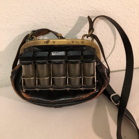 Smuk møntæske - Mahogni & blå velour indtræk. Ruminddeling: 12 firkanter (5x5cm)