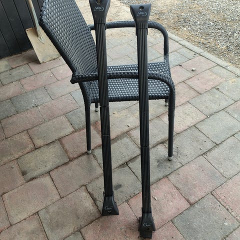 Peugeot maxi 0055 tagbøjler i sort. Sættet består af to tværstænger, fire fødder samt monteringsskruer. Tagbøjlerne er beregnet til montering på bilens tag og kan bruges som grundlag for f.eks. tagboks eller anden taglast. På den ene stang ses tydelig slitage/skade i overfladen, som fremgår af billederne.