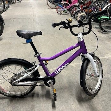 Woom børnecykel med 16" hjul i rød og hvid. Cyklen har lige styr, fodbremse bagtil og håndbremse foran. Udstyret med saddel, pedaler, støtteben og ringeklokke. Egnet som cykel til børn, der passer en 16" børnecykelstørrelse.