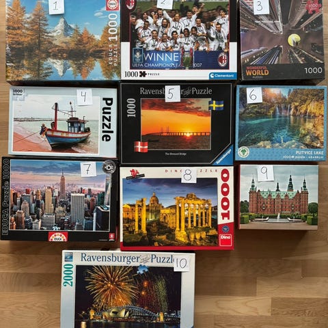 Puslespil med enten 500 eller 1000 brikker.