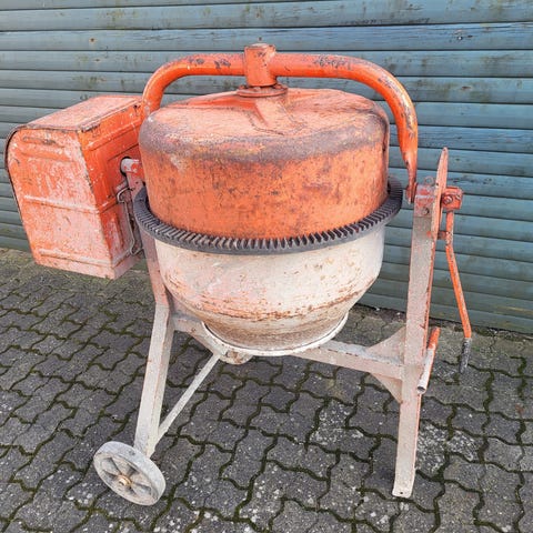 Guy Noel betonblander i rød farve. Blander monteret på stativ med hjul for nem flytning. Elektrisk drevet med motorhus i grå plast. Velegnet til blanding af beton, mørtel og lignende materialer på byggeplads eller ved gør-det-selv-arbejde.