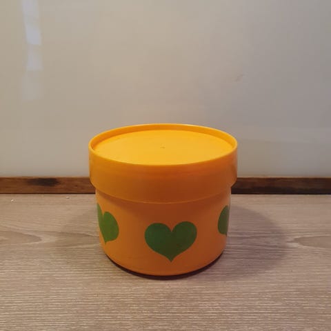 Retro strø / doserings dåse i klar plast og orange låg med doserings åbning fra Buchsteiner Germany 1970’erne sælges.