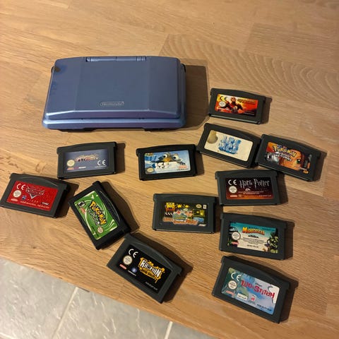 Nintendo DS håndholdt konsol i sølv. Konsollen har to skærme, hvor den nederste er trykfølsom til brug med stylus. Der medfølger oplader med EU-stik samt hårdt etui med plads til konsol og spil. Velegnet til Nintendo DS-spil og kompatibel med Game Boy Advance-spil via den nederste port (hvis tilgængelig). Konsollen har synlige brugsspor og klistermærker på ydersiden, som ses på billederne.