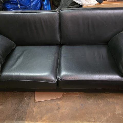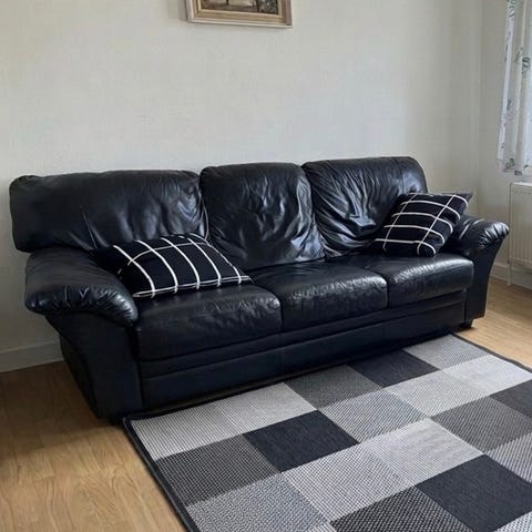 • Sofa & Lænestol: Sort læder. Tydelige slidmærker på læderet, men de er stadig gode at sidde i.