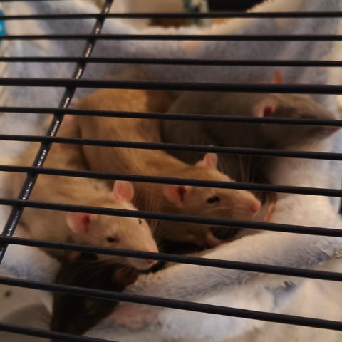 Tre rotter på ca 6 mdr sælges og et mindre bur medfølger.