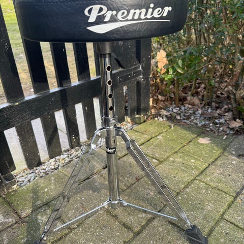 George Hennesey T-11 trommestol med rund, polstret siddeflade i sort kunstlæder. Højdejusterbart stativ i krom med tre ben og gummifødder for stabilitet. Egnet som trommestol til børn eller mindre personer og kan bruges sammen med trommesæt eller andre instrumenter, hvor der er behov for en kompakt, justerbar stol.