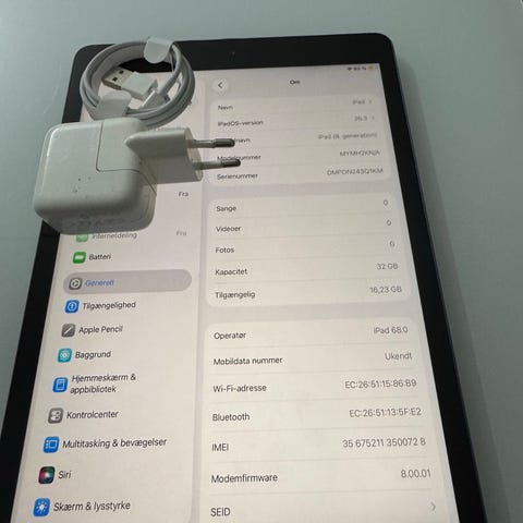 iPad 8. generation 32GB i Space Grey i god stand. Den har almindelige brugsspor på rammen/bagsiden, men skærmen er pæn uden ridser, og den fungerer helt perfekt.