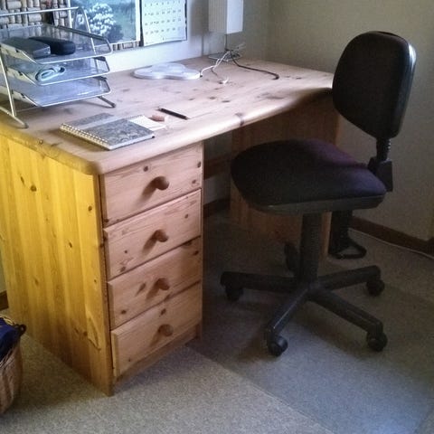 Bordplade massiv træ med afrunding på kanten fortil. Pladen ligger løst på benene. Pladens tykkelse er 2,5 cm.
