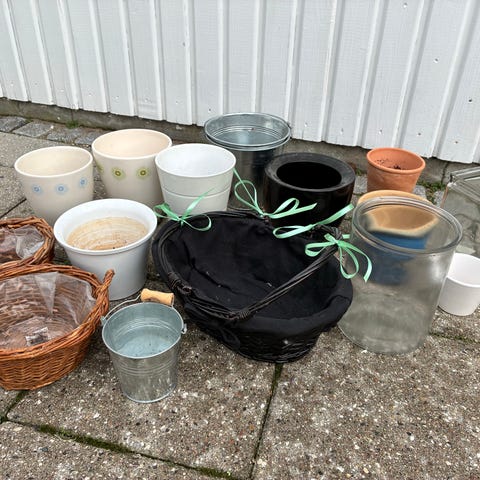 Plast vandkander i to størrelser og farver. Den ene vandkande er grøn og større, den anden er hvid og mindre. Kun til afhentning