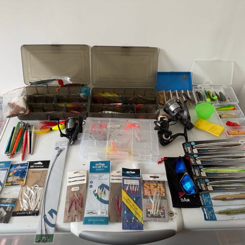 Lækkert kvalitetsgrej til kystfiskeri sælges. To gode og meget velholdte stænger til spin og bombarda, en hel masse fede blink og woblere i bedste kvalitet, kroge, svibler, og diverse udstyr. Det meste er kun lidt brugt og yderst velholdt.
