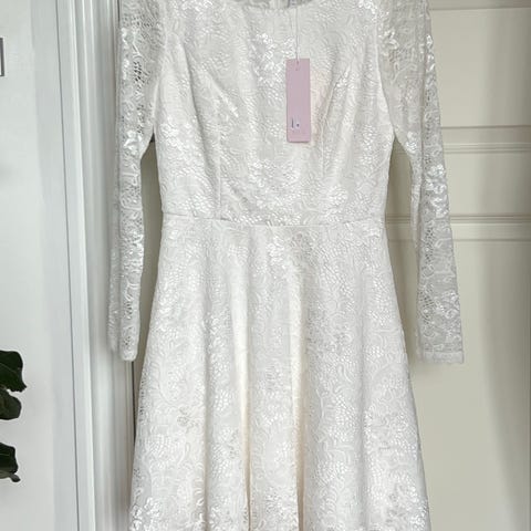 Helt hvid konfirmations kjole med blonde overdel. Smuk lukning med to knapper og lynlås.