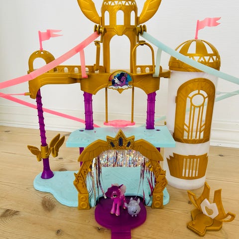 My Little Pony legetøjsslotsæt i plast. Slottet er primært lyserødt med grønne og hvide detaljer samt tryk med My Little Pony-motiver. Konstruktionen består af en base med trapper, åbne og lukkelige sider samt øverste etage med rækværk. Indvendigt er der små legeområder og dekorationer, som kan bruges til rolleleg med My Little Pony-figurer (figurer medfølger ikke, hvis ikke andet er angivet i annoncen). Egnet som legetøjsslotsæt til børn, der leger med My Little Pony-universet.