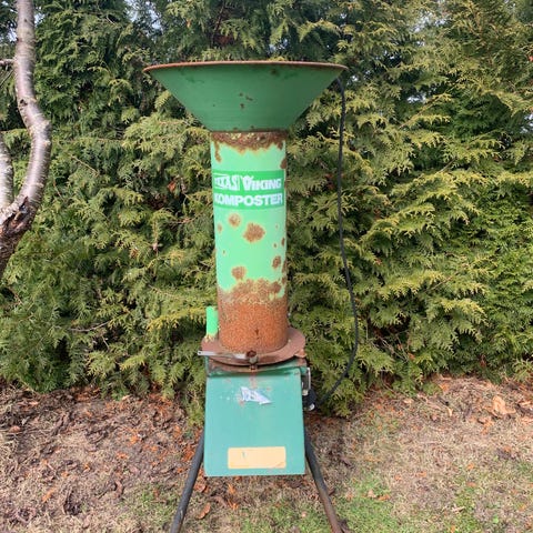 Viking GB 460 C kompostkværn med benzinmotor. Maskinen er udført i grønne, sorte og lysegrå materialer og står på to hjul for lettere flytning. Benzinmotoren driver kværnen til findeling af haveaffald som grene og kvas. Egnede anvendelser er have- og parkarbejde, hvor organisk materiale ønskes findelt til kompost eller bortkørsel. Maskinen har påfyldningsstuds for oven og udkast bagtil/nederst samt betjeningsknapper placeret ved motoren. Tager grene op til 75mm. Brugt ganske lidt. Nypris over 20.000 kr.
