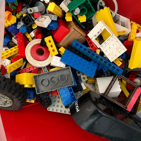 LEGO klodser blandet lot. Indeholder et mix af forskellige LEGO dele og elementer i flere farver og størrelser, herunder hjul, teknikelementer, plader og diverse specialdele. Egnet til frit byggeri, reservedele eller udvidelse af eksisterende LEGO samlinger.