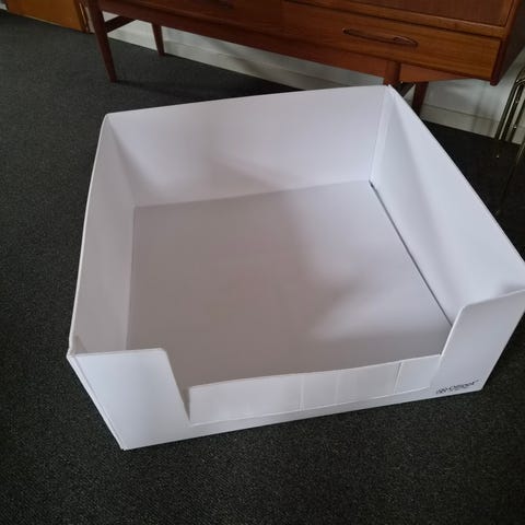Olliepetfødekasse til hund i hvid. Kassen er rektangulær med faste sider og åbning i den ene side, der kan justeres med løse plader. Egnet som fødekasse og hvalpekasse til mindre og mellemstore hunderacer. Fremstillet i hårdt plademateriale med glat overflade, der kan aftørres. Viser brugsspor og skade på et af hjørnerne, som ses på billederne. Kan indrettes med tæpper eller madrasser efter behov. 100x100cm