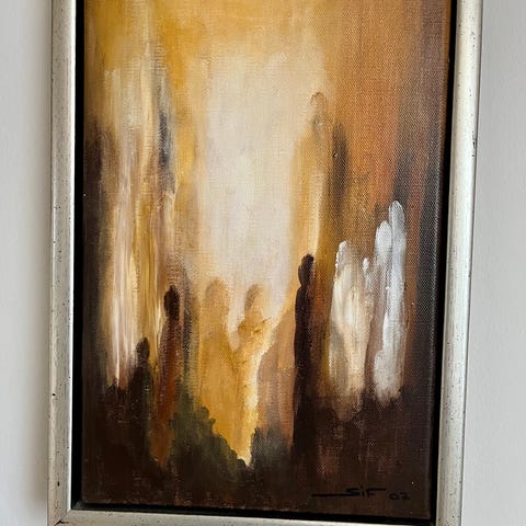 Sisse Karstensen maleri på lærred med englemotiv. Billedet viser en figur med store lyse vinger og kjole på gylden baggrund med cirkelformet element øverst. Maleriet er signeret af kunstneren på bagsiden. Velegnet som vægkunst i stue, gang eller andre opholdsrum.