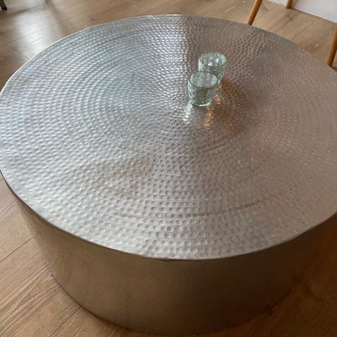 Contemporary beautiful white sofa/coffee table with a “flower/clover” top with a circular cut-out in the center and metal legs.