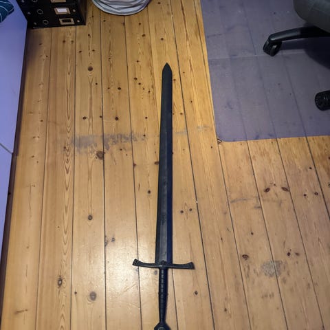 Warhammer Armoury Vanguard Imperial Arming Sword rollespilssværd (rollespil sværd) i grå. Sværdet har lige klinge med afrundet spids og tværskede med to spidse ender. Håndtaget er mørkt og struktureret for bedre greb. Egnet til brug som rekvisit til rollespil, udklædning eller dekoration.