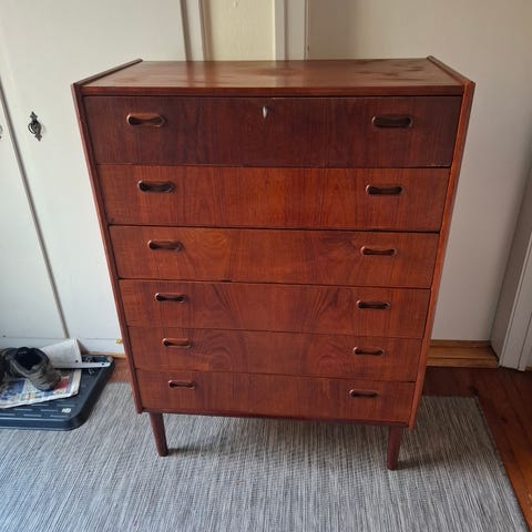 Der er her tale om 2 stk. retro teak kommoder m. 5 dybe / flade skuffer.