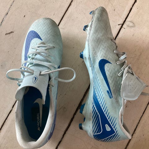 Nike fodboldstøvler i grå med gule detaljer. Støvlerne har snørelukning og soklignende skaft omkring anklen for ekstra støtte. Ydersålen er udstyret med faste knopper, der er velegnede til brug på græsbaner. Overdelen er i syntetisk materiale, som er let at rengøre. Velegnet som fodboldstøvler til træning og kamp.