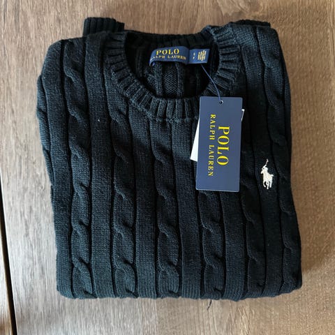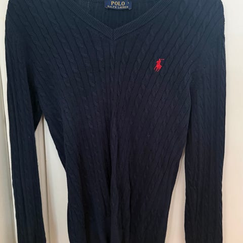 Ralph Lauren sweater til dame i størrelse M. Strikket i uld og udført i sort med motiv af bjørn på fronten. Rund hals og lange ærmer med ribkant ved hals, ærmer og forneden. Velegnet som varm hverdagstrøje eller til brug i køligere vejr.