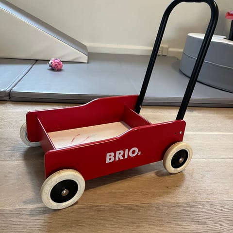 BRIO gåvogn til børn i sort med hvidt håndtag og hjul med rød detalje. Klassisk model med solid kasse til legetøj og andre småting. Velegnet som støtte, når barnet øver sig i at gå, og som transportvogn til legetøj i hjemmet.