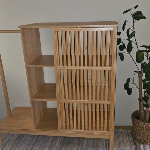Tyk bambus. Der er 4 stk store knage der kan drejes ind og ud til begge sider efter behov. Måler: L - 92 cm og H - 30 cm. Perfekt stand