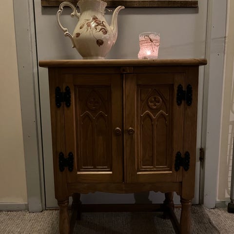 Træskab med skuffe i brun træfinish. Skabet har en enkelt låge nederst og en skuffe øverst med metalgreb/lås. Toppladen er rektangulær med synlig træstruktur. Skabet står på små fødder og har en enkel, klassisk udformning, velegnet til opbevaring i fx stue, entré eller soveværelse.