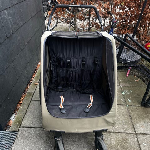 Lionelo cykel klapvogn med tre hjul i turkis. Vognen har styr til voksen bagpå, sikkerhedssele, bøjle foran sædet.. Der er kaleche for let beskyttelse mod sol og vind.