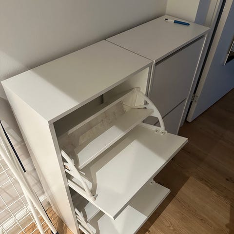 B50 x H104 x D15 cm. Originally 600 dkk in JYSK. Shoe cabinet that can hold up to 6 shoes. Possible to leave on the floor or hang up on the wall. There is a small bend on the bottom right corner, as shown in picture #4. All three shelves open at once.