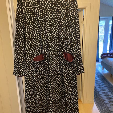 Gudrun Sjödén hverdagskjole i bambusviskose i sort, str. XXL. Kjolen har et mønstret blomsterprint i flere farver og er forsynet med knaplukning foran. Modellen har lange ærmer og en løs, komfortabel pasform, velegnet som hverdagskjole til kvinder. Materialet er let og blødt bambusviskose, som giver en behagelig fornemmelse mod huden. Tørklædet er ikke med i prisen