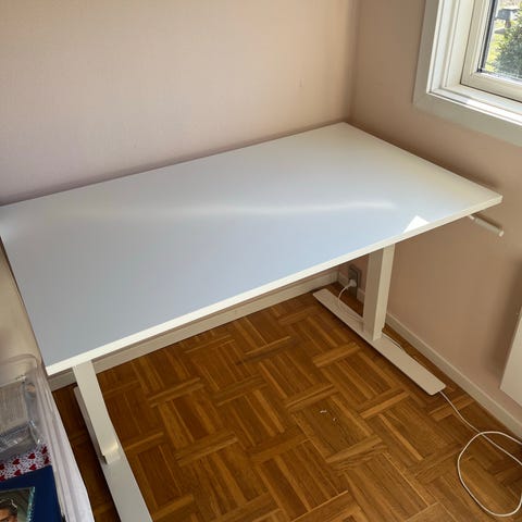 Hæve sænke skrivebord 180x90 cm. Elmotor. Skuffeskab medfølger. Det ene håndtag er gået i stykker på 1 skuffe men kan erstattes. Bordet er i rigtig god stand. Sælges samlet. 117 cm i fuld højde. Evt. giv bud. Skal sælges hurtigt.