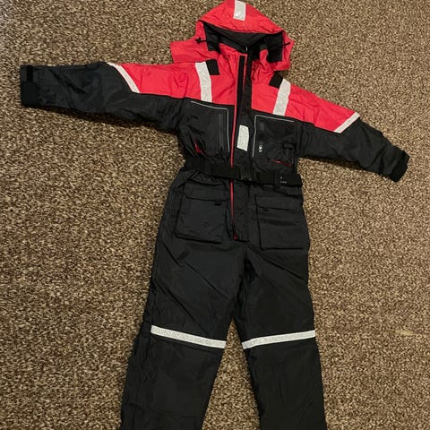 Overlevelsesdragt som heldragt i rød farve med hætte og reflekser. Dragten har flere udvendige lommer med velcrolukning samt justerbare stropper. Egnet som beskyttende beklædning til brug på vand eller i andre krævende udendørs miljøer, hvor der er behov for synlighed og isolering.