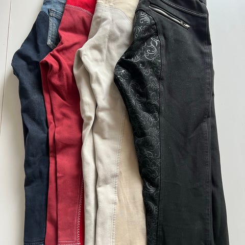 Fleecejakken er mørkeblå med lynlås, høj krave og lommer fra Horze str 146-152. Blå langærmet trøje med lynlås i halsen fra Horze str 146-152. CRW Bordeaux langærmet trøje med lynlås i halsen str 158-164. Hvid kortærmet stævnetrøje med krave og knaplukning 146-152 fra Equipage. Ridetøj til piger, se også øvrige annoncer med ridebukser, hjelm, støvler mm
