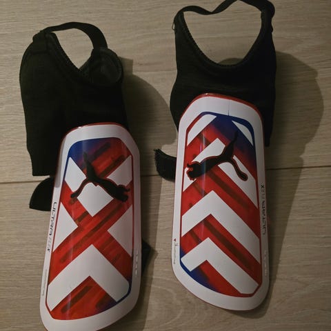 Puma ultra light - 3-6 år. benskinner i sort og hvid. Letvægts benskinner med hård yderskal og polstret inderside. Velegnet til fodbold og andre sportsgrene, hvor der er behov for beskyttelse af skinnebenene. Fastgøres med elastikrem for at holde benskinnerne på plads under aktivitet.