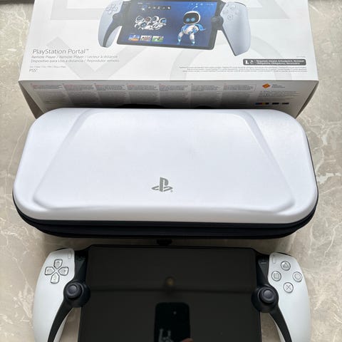 Sony Playstation 5 Portal håndholdt konsol i sort/hvid. Enheden er designet til brug sammen med Playstation 5 og gør det muligt at spille PS5-spil via fjernspil på den indbyggede skærm. Konsollen har integrerede kontrolenheder i hver side med layout svarende til DualSense-controlleren. Leveres med original æske som vist på billederne.
