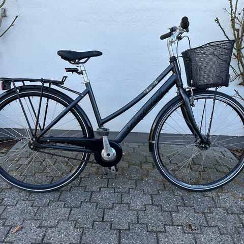 Raleigh hybridcykel til kvinde med stelstørrelse M og 28" (700c) hjul. Cyklen har klassisk dame-/lav indstigning, sort stel og sølvfarvede skærme. Udstyret med kurv foran og navgear på baghjulet. Egnet til daglig transport og bykørsel. Stellet er udformet til kvinde og giver en oprejst og komfortabel kørestilling.