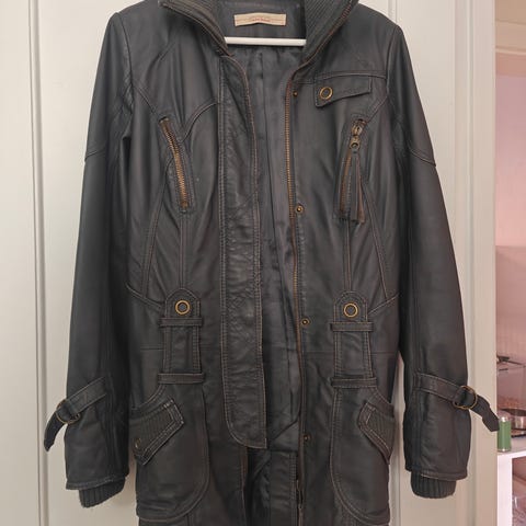 Læderjakke til kvinder i sort, størrelse M. Jakken er lavet i læder og har gennemgående lynlås foran. Modellen har lange ærmer og sidelommer med lynlås. Kort, figursyet pasform egnet til hverdagsbrug og overgangsvejr.