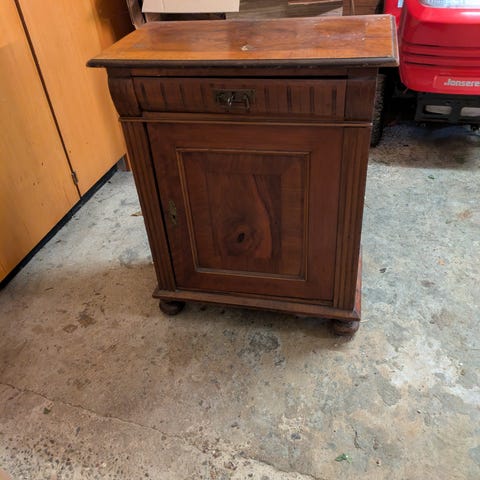 Skab i træ med én låge og indvendige hylder. Skabet er malet og har et dekoreret blomstermotiv på lågen. Indvendigt er der flere faste hylder, som giver plads til opbevaring af fx service, tekstiler eller andre genstande. Velegnet som mindre opbevaringsskab i fx køkken, entré eller stue. Trænger til lidt kærlighed og en enkelt skrue i lågen.