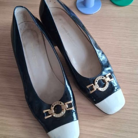 Sort læder med karakteristisk firkantet tå og grafisk cirkeldetalje på fronten. Elegant T-strap design med lav blokhæl – meget typisk minimalistisk 90’er stil.