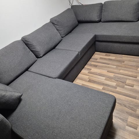 Stor U sofa, måler cirka 365 i bredden og i dybden på højre chaiselong cirka 180 og cirka 200 cm på venstre chaiselong.