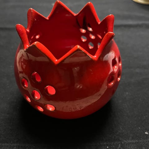 En fin og velholdt rød keramik fyrfadsstage. De store fyrfadslys passer perfekt i den og den giver et hyggeligt lys opad og ud gennem hullemønsteret. Den er signeret Th nedenunder, men jeg ved ikke hvilket mærke det er.