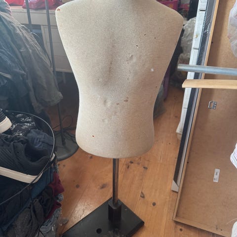 Skrædderbuste til dame med gulvstativ. Sættet består af to buster i hel figur, én med naturfarvet overdel og sort stativ og én med lys overdel og grønt stativ. Velegnet til syning, tilretning af tøj eller udstilling af beklædning.