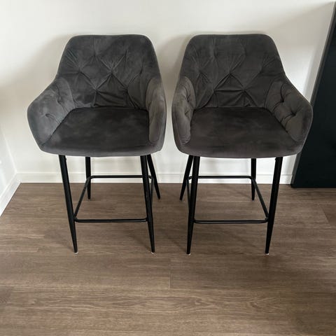 2 pæne og velholdte barstole i sort velour sælges. Bemærk at de er høje. Kender ikke mærket på dem.