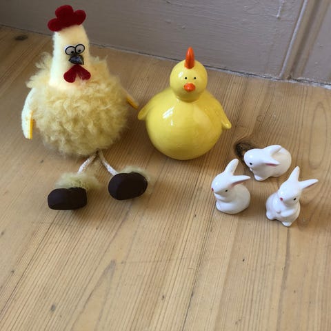 Glaskylling med tre æg, stofpynt, lille plastikkanin og postkort. Sælges samlet