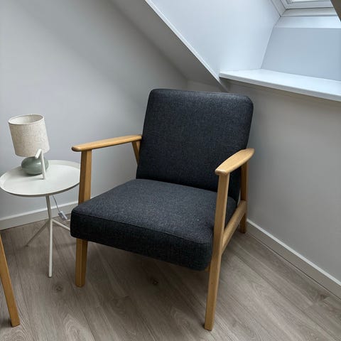 Flot og meget velholdt lækker bred lænestol med puder. Brugt meget lidt. Grå med sorte ben. Med aftageligt og vaskbart betræk på puderne. Ingen pletter eller lignende. Fra ikke-ryger hjem