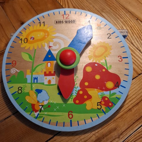 Træ læringsur og aktivitetsbræt til børn. Brættet har stort ur i midten med bevægelige visere og minutmarkeringer. Øverst er der talrække til dato, og i siderne skydere til ugedage og måneder med dansk tekst. Nederst er der roterende hjul med illustrationer af vejr og dag/nat. Brættet er udstyret med beslag på bagsiden til ophæng på væg. Velegnet til at øve tid, dato, ugedage, måneder, årstider og vejr på en overskuelig måde.