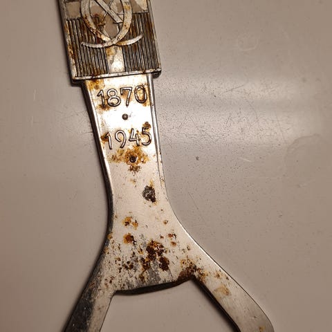 Vedhænget er stemplet 930, hvilket betyder 93 % sølv (høj sølvlødighed). Denne type monogram blev brugt i Danmark under Kong Christian X’s regeringstid og ses ofte på patriotiske smykker og souvenirs fra første halvdel af 1900-tallet.