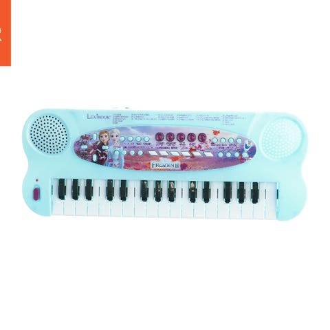 Legetøjskeyboard med 24 tangenter, farverige knapper og forskellige lydfunktioner. Designet til børn med håndtag for nem transport. Fremstillet i plastmateriale med rød, blå og gul farve.