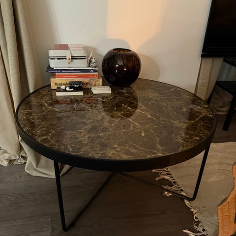 Rigtig pænt rundt glas sofabord med sort metal stel og med målene : 120 i diameter og 36 cm i højden. Fra Ilva.